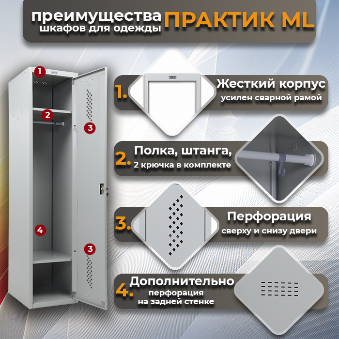 Этот шкаф представляет собой надежное и долговечное решение для хранения одежды в условиях высокой эксплуатации. Изготовлен из жесткого металла, усиленного сварной рамой, что гарантирует долговечность и устойчивость конструкции.